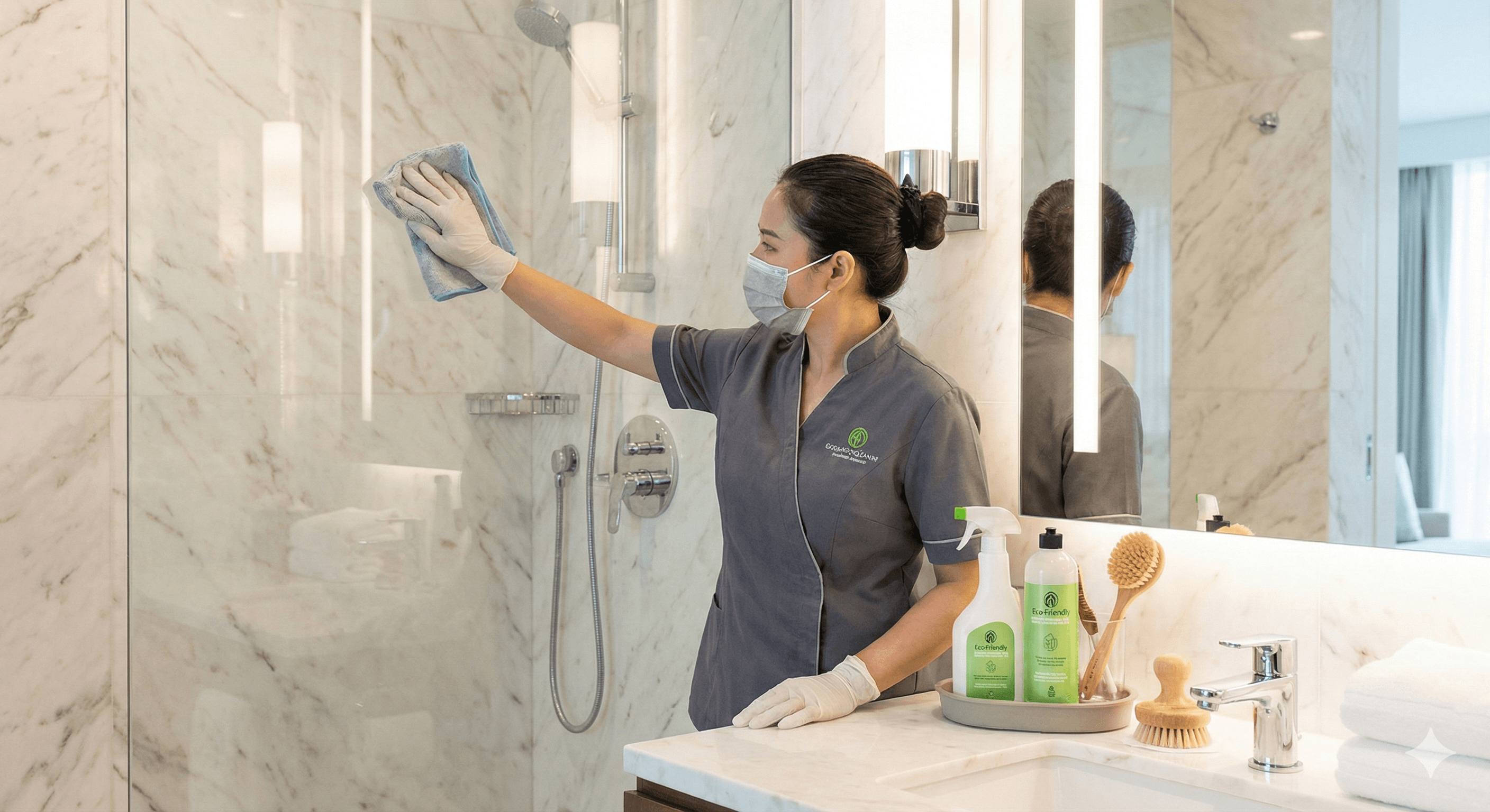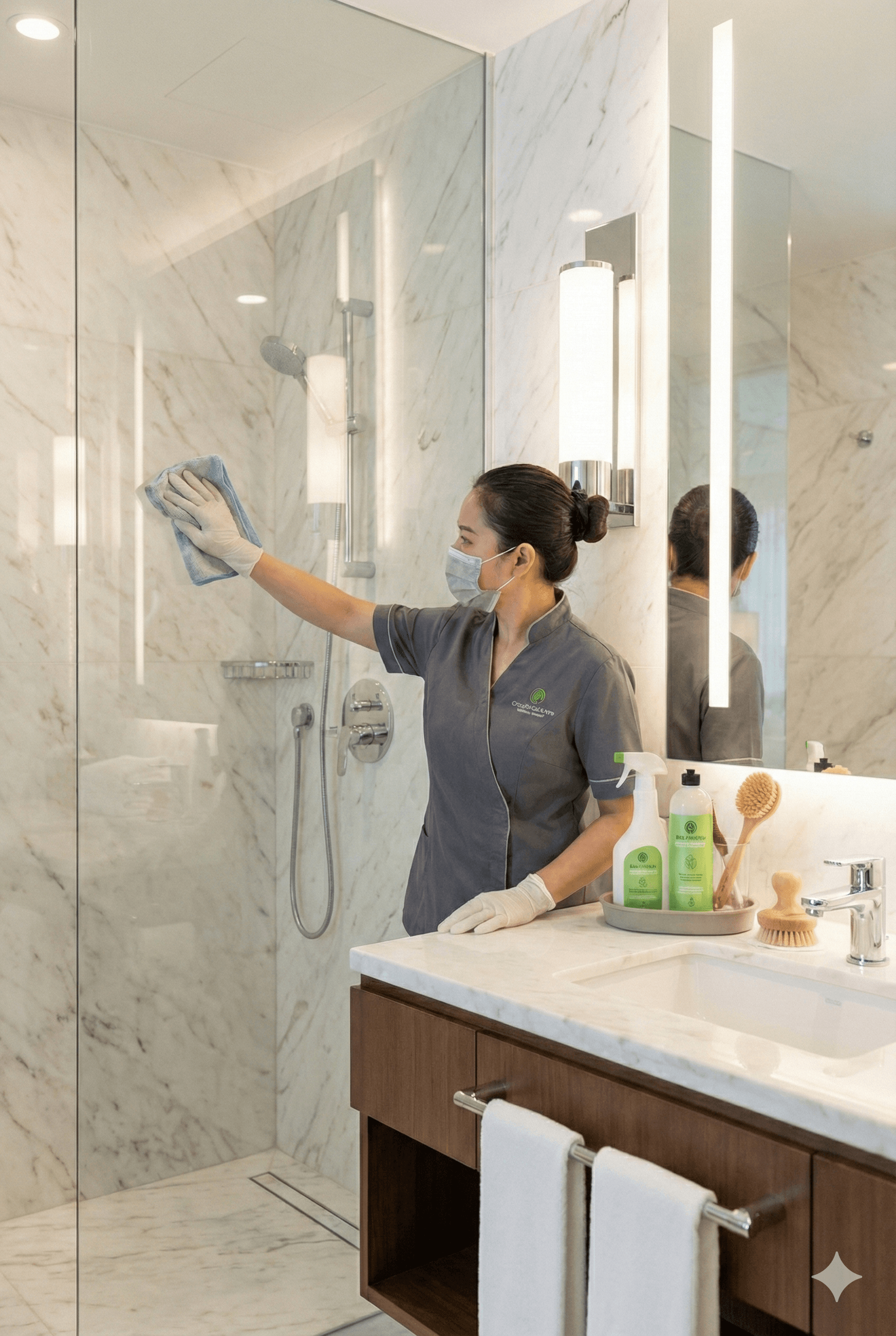 Eco-friendly products applied room by room with professional tools. Every surface, tile, and fixture cleaned to a spotless standard.